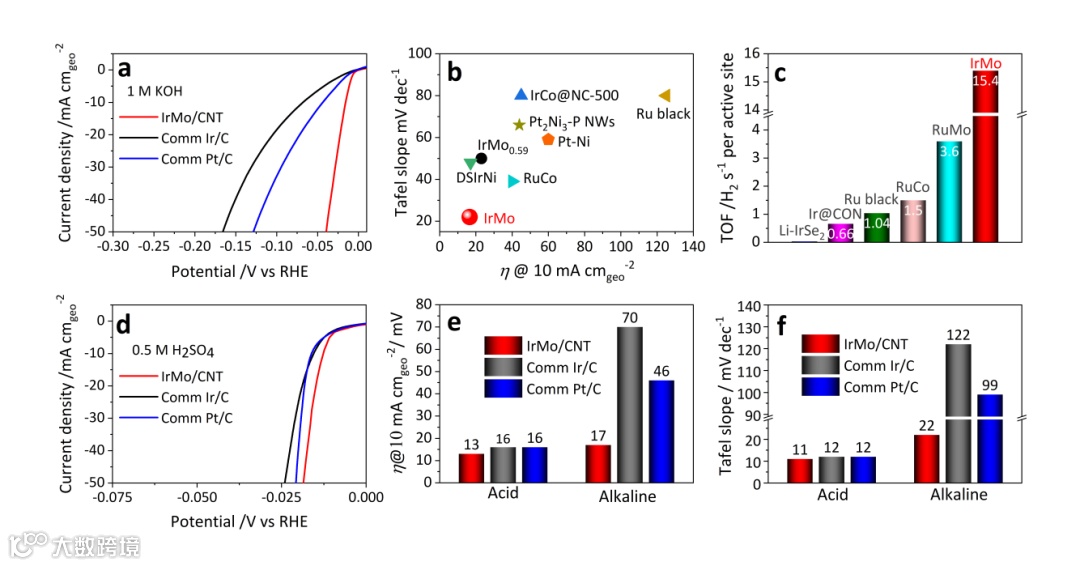 a, H2-saturated 1 M KOH中的HER极化曲线。b, IrMo/CNT与典型HER催化剂的HER性能比较(Tafel斜率&10 mAgeo cm2的过电位10)。c, IrMo/CNT与典型HER催化剂的TOF(@50 mV)比较。d, H2-saturated 0.5 M H2SO4中的HER极化曲线。e, 催化剂在酸性和碱性HER中的10比较。f, 催化剂在酸性和碱性HER中的Tafel斜率比较。