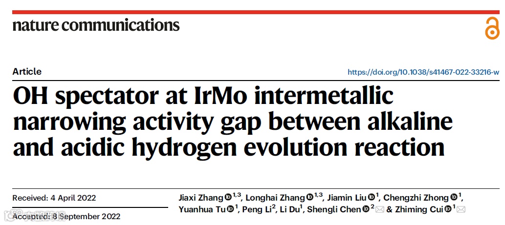 基于此,华南理工大学崔志明教授课题组与武汉大学陈胜利教授合作,在国际知名期刊Nature Communications上发表题为“OH spectator at IrMo intermetallic narrowing activity gap between alkaline and acidic hydrogen evolution reaction”的研究论文。
