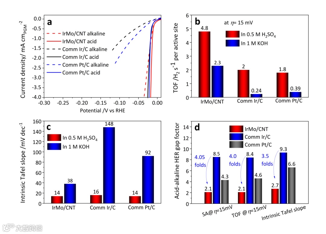 本研究开发出了一种负载在碳纳米管上的IrMo金属间化合物电催化剂,在15 mV的过电位下,其比活性高达0.95 mA cmPt-2,分别是Ir/C和Pt/C的14.4和9.5倍。值得注意的是,它在碱性介质中的活性与酸性中的相当接近,且在酸性和碱性介质中的活性差距仅有Ir/C的四分之一。