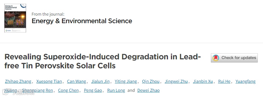 基于此,国际学术期刊Energy & Environmental Science在线发表了四川大学赵德威教授、北京师范大学龙闰教授、中科院福建物构所高鹏教授合作团队题为“Revealing Superoxide-Induced Degradation in Lead-free Tin Perovskite Solar Cells”的研究成果。