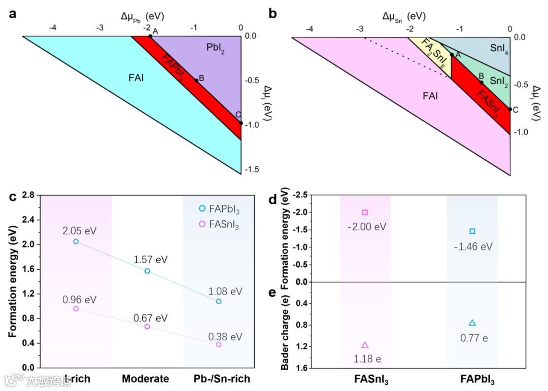 图3. 第一性原理计算相关:FAPbI3与FASnI3以相对化学势函数的热平衡生长条件的相图,符合两种钙钛矿热力学平衡生长条件的区域用红色标记。