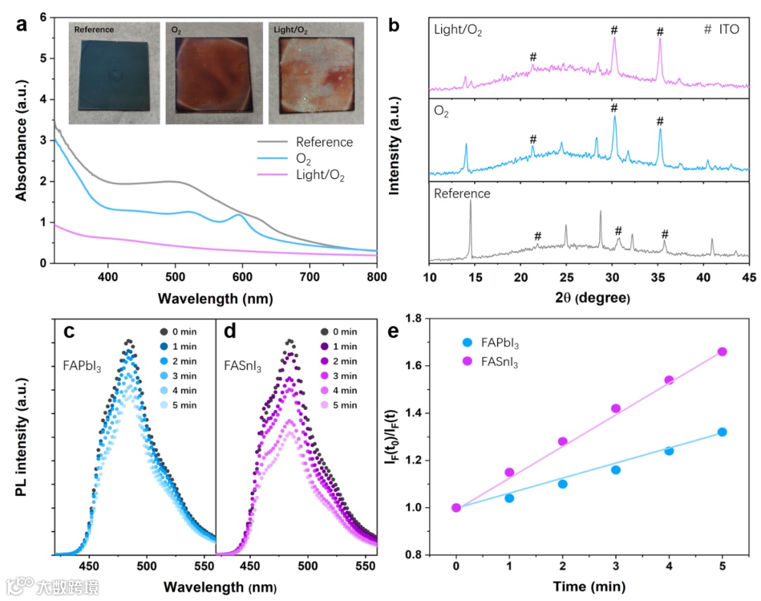 本工作首次发现锡基钙钛矿FASnI3在光氧暴露条件下比仅在氧气暴露条件下会发生更加严重的降解,这是由于氧气接受光激发电子从而产生的超氧离子所引起的。