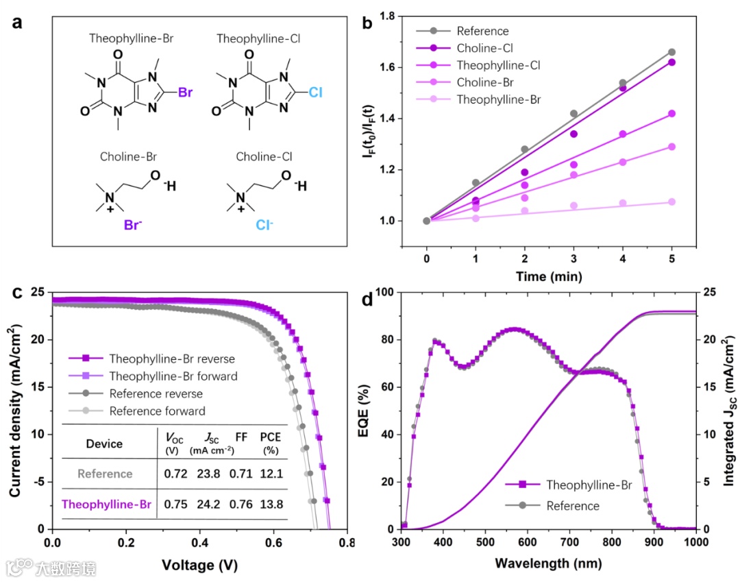 图4. 所采用的多种含卤素的钝化分子及它们相应的抑制超氧离子生成的能力,其中theophylline-Br最为优异,因此被用于器件制备,得到的器件效率从12.1%显著提升至13.8%。