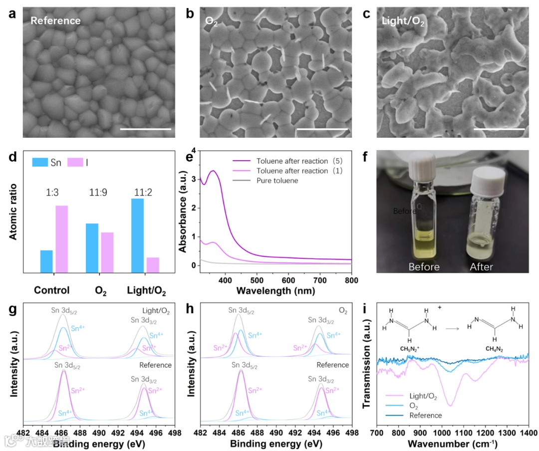 图2. 用于证明超氧诱导的FASnI3降解过程的产物的相关表征,其降解过程为:,SnI2会被进一步氧化为SnO2。