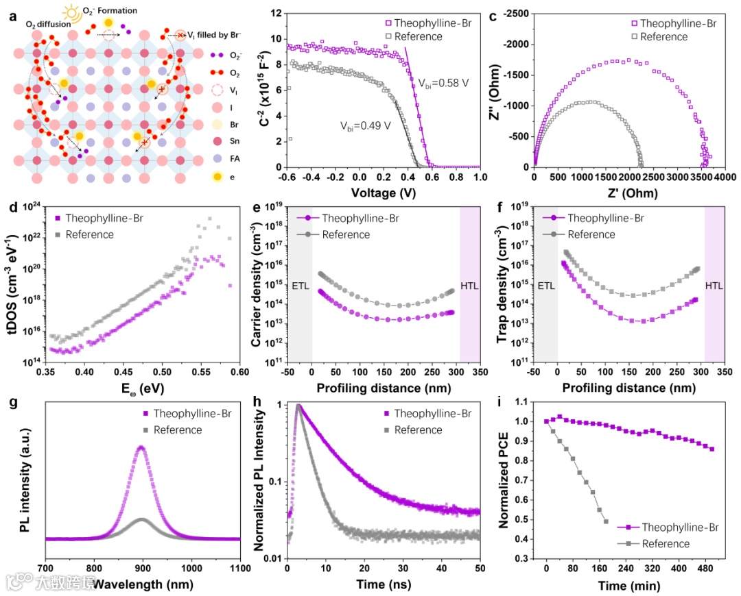 结果表明,theophylline-Br的引入有效填补了FASnI3中的表面/内部碘空位,从而抑制了超氧离子的生成,显著改善了器件的光氧稳定性和效率。