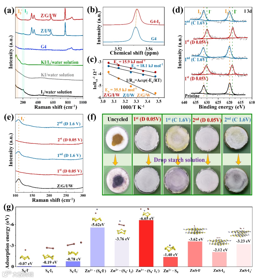 系统探究了G4-I2的协同和催化机理。研究表明,I2与G4之间产生了电子供体-受体相互作用,I2可以被G4的给电子基团(-COC-)还原成I3−聚阴离子,这对于催化硫的固-固转化更加有效,明显降低活化能(15.9 kJ mol−1)。此外,I3−↔I−的催化对在水系Zn-S电池中也具有出色的可逆性和催化活性。