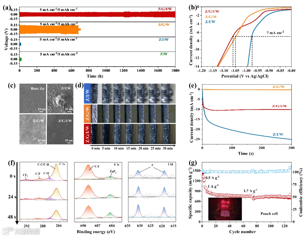 系统探究了“鸡尾酒优化”电解液对锌阳极稳定的作用机制。研究表明,G4存在的情况下,循环时由I3−聚阴离子引发部分Zn(OTF)2分解产生有机-无机固体电解质膜(SEI)有效保护Zn阳极,并且引导Zn2+的扩散,从而大幅提升锌阳极稳定性(更长的寿命,更高的HER电位,更平坦的锌沉积层)。