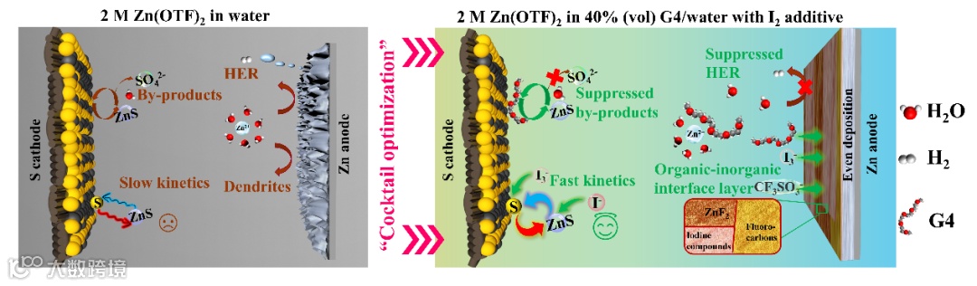 图1“鸡尾酒优化”电解液助溶剂-催化剂协同效应提升锌硫电池性能示意图