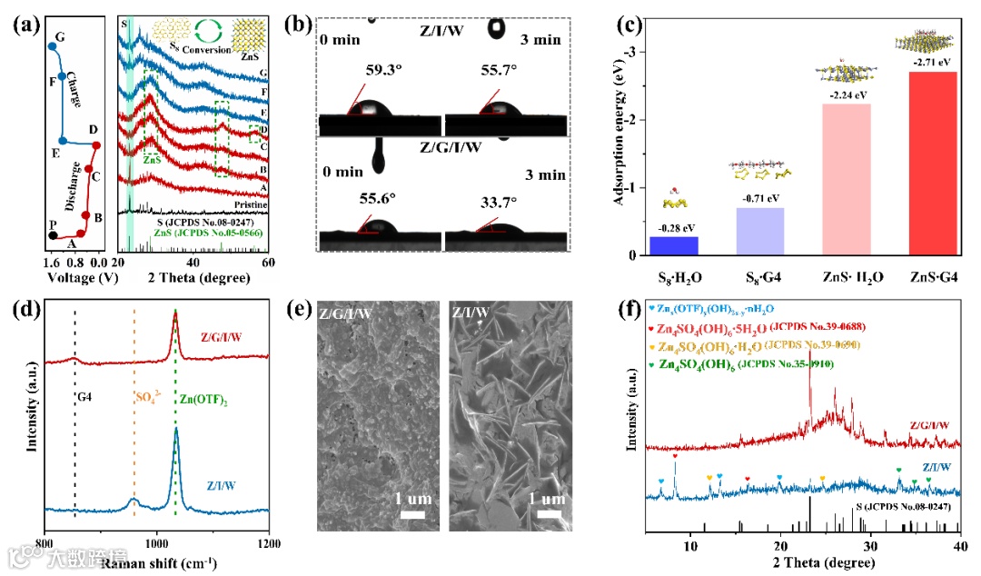 系统地探究了“鸡尾酒优化”电解液对S阴极的积极影响。研究表明 G4分子对于S阴极具有更强的亲和力,有效改善了电解质的润湿性,屏蔽了水与S阴极的直接接触,提升了电极界面的电荷传输。此外,G4的存在可以明显抑制硫转化过程中歧化产物(SO42−)的生成,避免了容量的快速衰减。