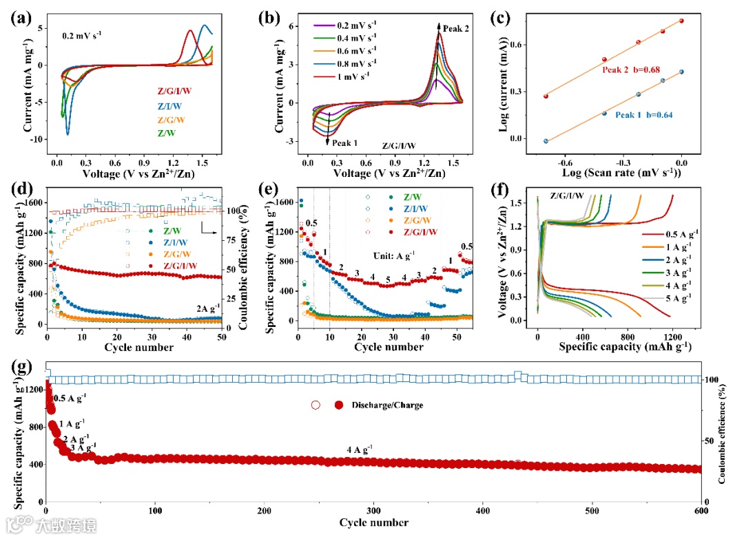 本文选取了四种类型的2M Zn(OTF)2电解质,分别为2M Zn(OTF)2/水(Z/W)、2M Zn(OTF)2/G4/水(Z/G/W)、2M Zn(OTF)2/I2/水(Z/I/W)和2M Zn(OTF)2/G4/I2/水(Z/G/I/W),以测试Zn-S电池的电化学性能。结果表明“鸡尾酒优化”的电解液(Z/G/I/W)表现出更高的比容量,良好的倍率性能和优异的循环稳定性(在0.5 A g−1下获得1140 mAh g−1的高容量,在4 A g−1下600次循环后容量保持率达到70%)。