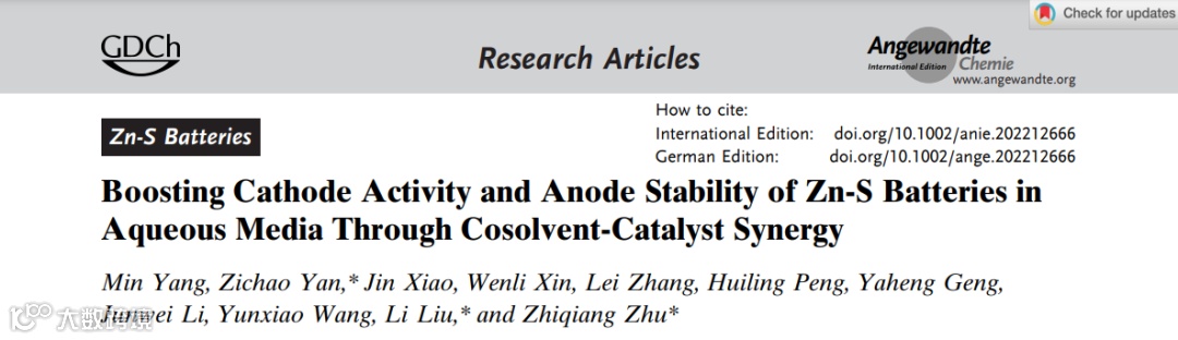 基于此,湖南大学朱智强教授、颜子超助理教授与湘潭大学刘黎教授合作,在国际知名期刊 Angew. Chem. Int. Ed. 上发表题为“Boosting Cathode Activity and Anode Stability of Zn-S Batteries in Aqueous Media Through Cosolvent-Catalyst Synergy”的研究论文。
