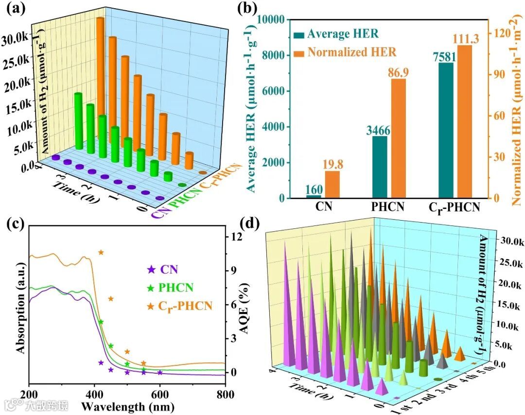 图3. CN、PHCN和Cr-PHCN的(a)产氢总量、(b)平均产氢速率和(c)表观量子产率随波长变化;(d) Cr-PHCN的循环产氢速率