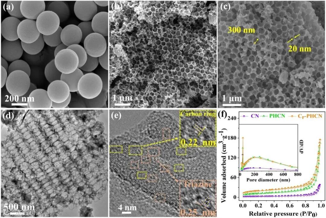 图2. (a)SiO2、(b)PHCN和(c)Cr-PHCN的SEM照片;Cr-PHCN的(d)TEM和(e)HRTEM照片;(f)BET测试结果