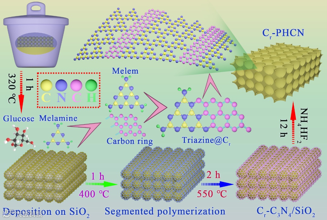 随着温度继续升高到400 ℃,葡萄糖分子脱水后缩聚为碳环单元,三聚氰胺分子会缩聚为蜜勒胺单元。继续升高温度逐渐开始发生缩聚反应,由于碳环单元与蜜勒胺单元原子网络结构相似,一部分碳环与蜜勒胺拼接缩聚为三嗪@碳环(Triazine@Cr)结构。最后在550 ℃时彻底聚合为碳环面内无缝拼接的3D蜂窝氮化碳网格结构。使用氟化氢铵来除去二氧化硅纳米微球模板后,得到多层、有序、多孔的Cr-PHCN样品。