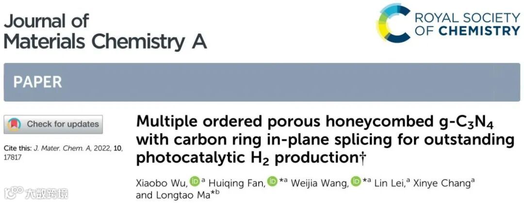 相关成果以“Multiple Ordered Porous Honeycombed g-C3N4 with Carbon Ring In-plane Splicing for Outstanding Photocatalytic H2 Production”为题发表在国际著名期刊《Journal of Materials Chemistry A》上。该论文第一作者为博士研究生邬晓波,樊慧庆教授、王维佳副教授和马龙涛教授为共同通讯作者,西北工业大学为论文第一作者单位和通讯作者单位。