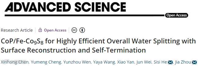 基于此,哈尔滨工业大学(深圳)的周佳与何思斯副教授等人在国际知名期刊Advanced Science上发表题为 “CoP/Fe-Co9S8 for Highly Efficient Overall Water Splitting with Surface Reconstruction and Self-Termination”的观点文章。