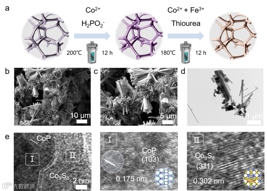 图1. 异质界面CoP/Fe-Co9S8电催化剂的制备与形貌结构表征