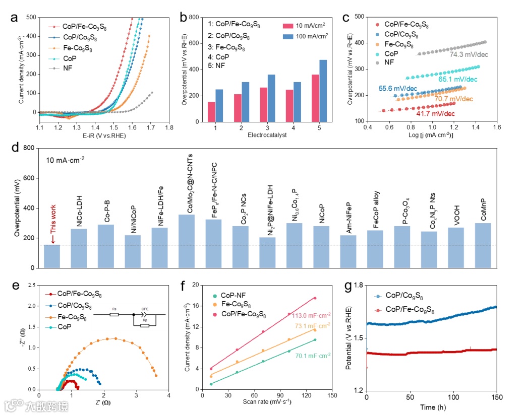 此外,CoP/Fe-Co9S8表现出了更低的Tafel斜率、更小的电荷转移电阻以及更大的电化学活性表面积,表明异质结构建策略有效增加了活性位点的数量,同时实现了更快的电化学反应动力学。更重要的是,CoP/Fe-Co9S8在连续电解150小时后显示出长期耐久性。