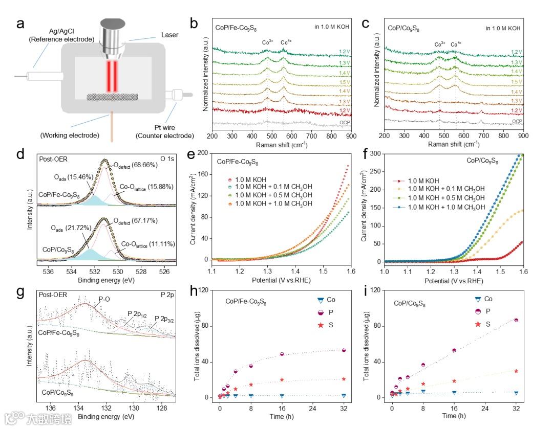 作者还使用甲醇分子探针测定在CoP/Fe-Co9S8表面的OH*覆盖率,结果表明CoP/Fe-Co9S8在外加电势的条件下去质子化更容易,从而有利于OER动力学。此外,通过电感耦合等离子体发射光谱进一步证实Fe的掺杂可以导致表面重构的自终止,抑制P和S的损失,保证了OER稳定性。