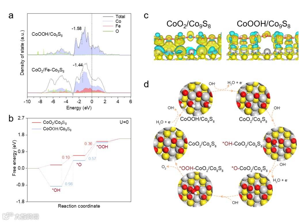 通过DFT计算进一步探索了CoP/Fe-Co9S8催化性能增强的机理。计算结果表明,CoO2/ Fe-Co9S8在费米能级附近表现出更高的TDOS,表明Fe掺杂可以明显增加导电性。OER过程中的吉布斯自由能计算结果表明CoO2/Co9S8上的反应决速步为O-O偶联,能量势垒为0.36 eV,低于CoOOH/Co9S8的决速步(OH*脱质子化)能量势垒0.98 eV。