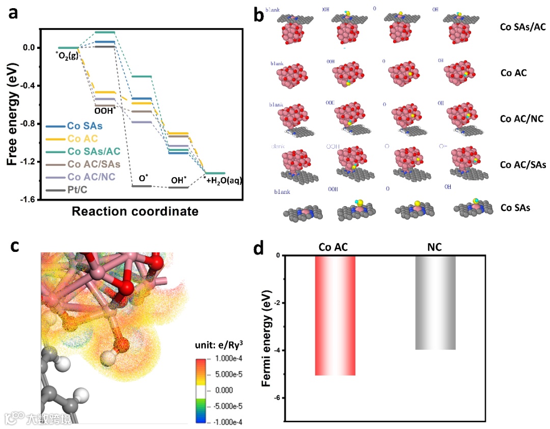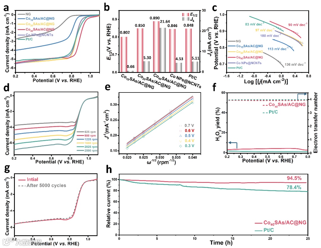结合实验表征和DFT计算证明了Co单原子和团簇对ORR活性提升起到关键作用,所制备的Co40SAs/AC@NG具有最佳的碱性ORR性能,半波电位为0.890 V,优于商用 Pt/C。