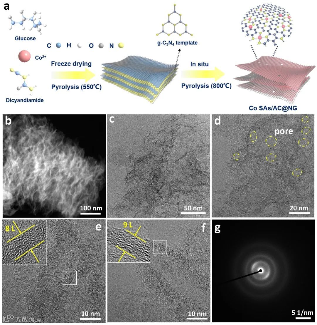 图1. Co40SAs/AC@NG的合成示意图和形貌表征
