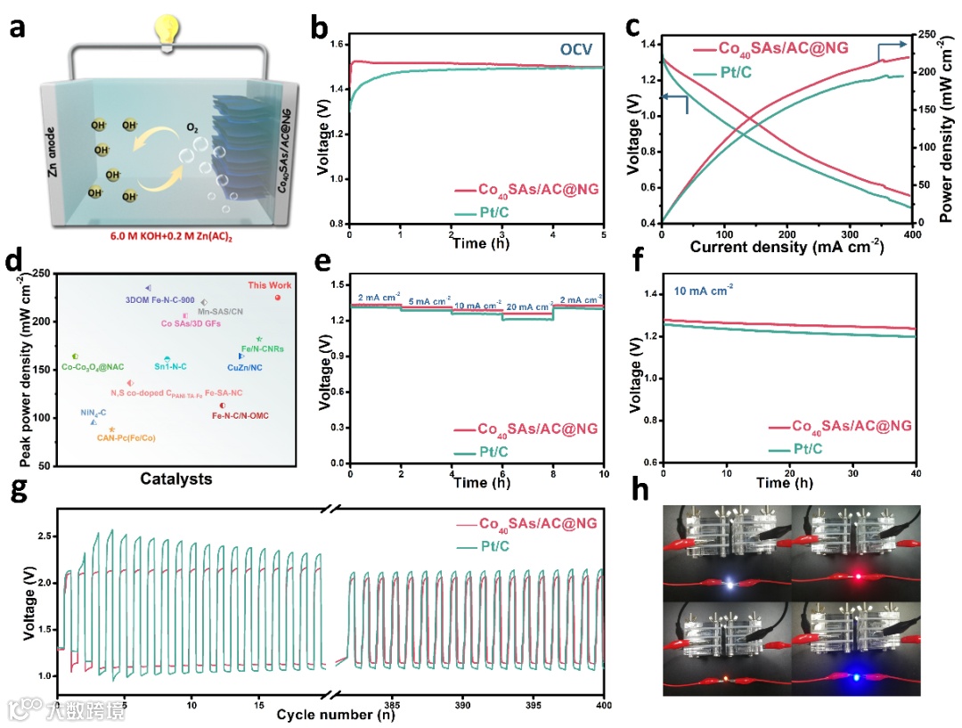 图6. Co40SAs/AC@NG和Pt/C作为阴极催化剂组装的锌空气电池性能