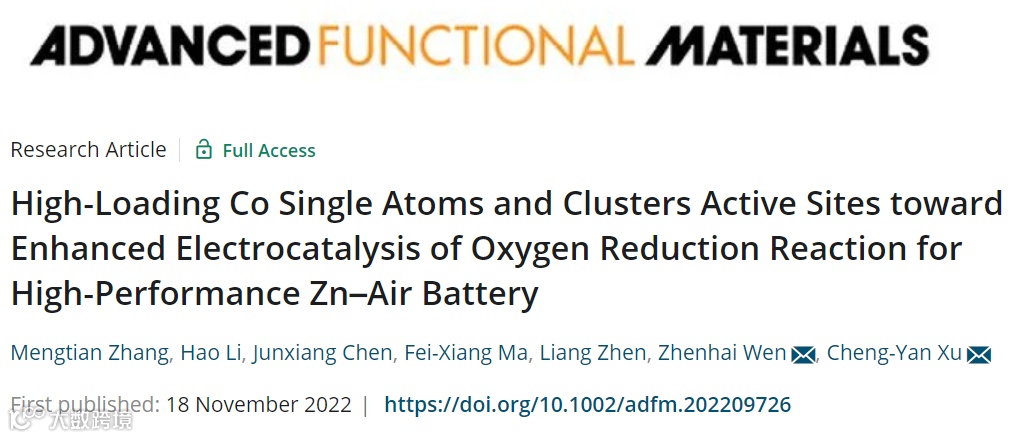 基于此,来自哈尔滨工业大学(深圳)的徐成彦教授与中国科学院福建物质结构研究所温珍海教授合作,在国际知名期刊Advanced Functional Materials上发表题为“High-Loading Co Single Atoms and Clusters Active Sites toward Enhanced Electrocatalysis of Oxygen Reduction Reaction for High-Performance Zn–Air Battery”的文章。