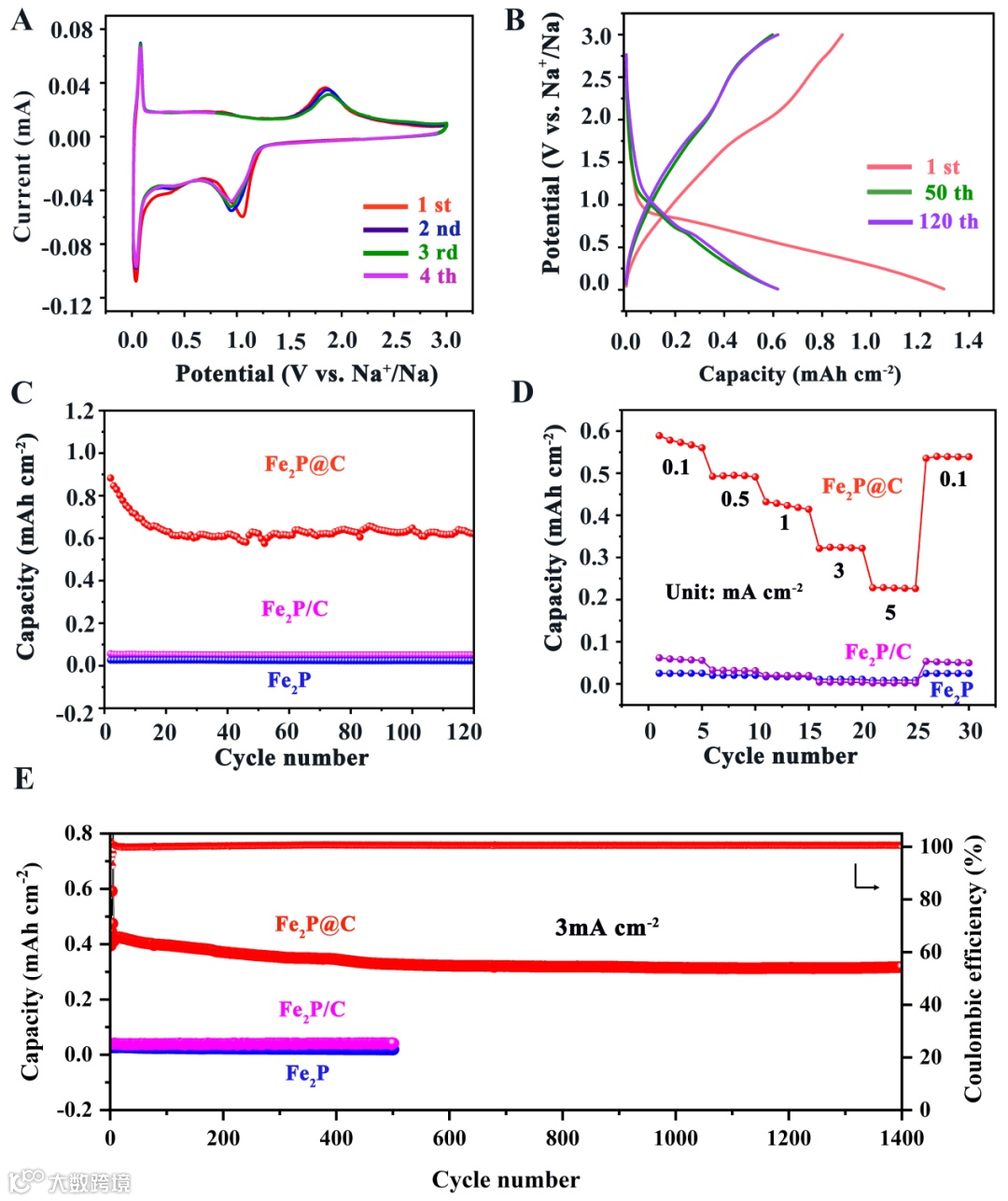 Fe2P@C泡沫铁一体化负极表现出超高面容量和长循环性能。在0.1 mA cm-2电流密度下循环120次后,钠离子电池的可逆容量为0.62 mAh cm-2。在3 mA cm-2的高电流密度下,钠离子电池经过1400次循环后的容量保留率为80.25%。