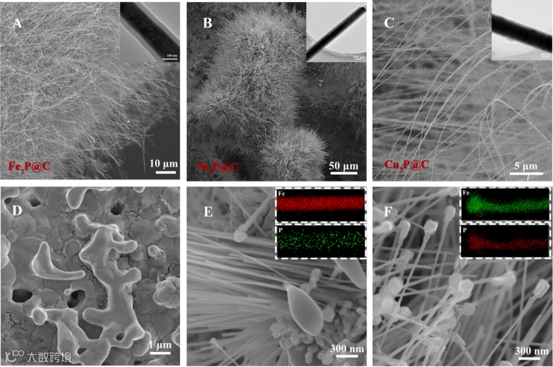 图2 (A) Fe2P@C, (B) Ni2P@C, (C) Cu3P@C的 SEM图像; (D) Fe泡沫的SEM图像, (E) 650 °C时Fe2P@C, (F) 750 °C时Fe2P@C的SEM图像。