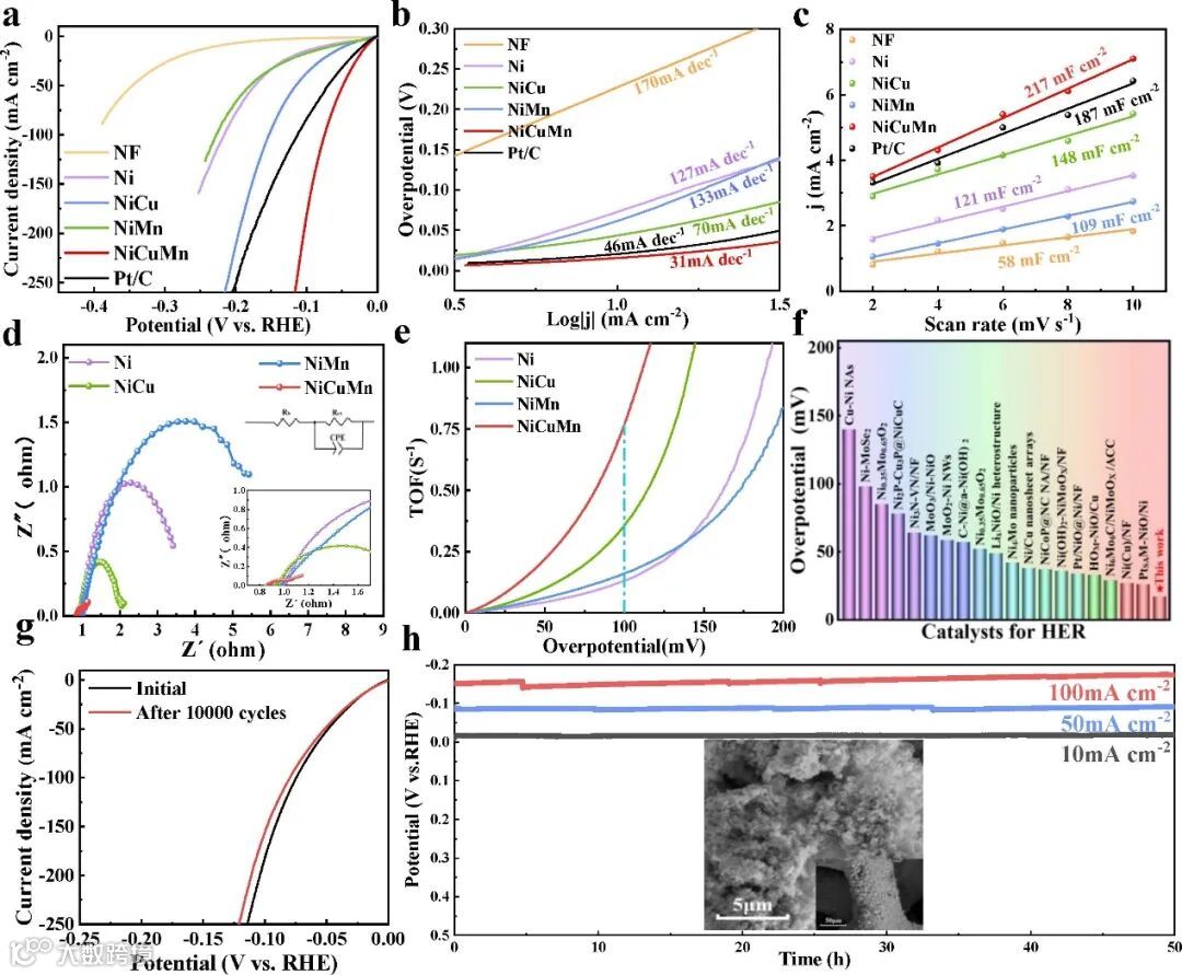 图3. NiCuMn在1.0 M KOH溶液中HER催化活性。