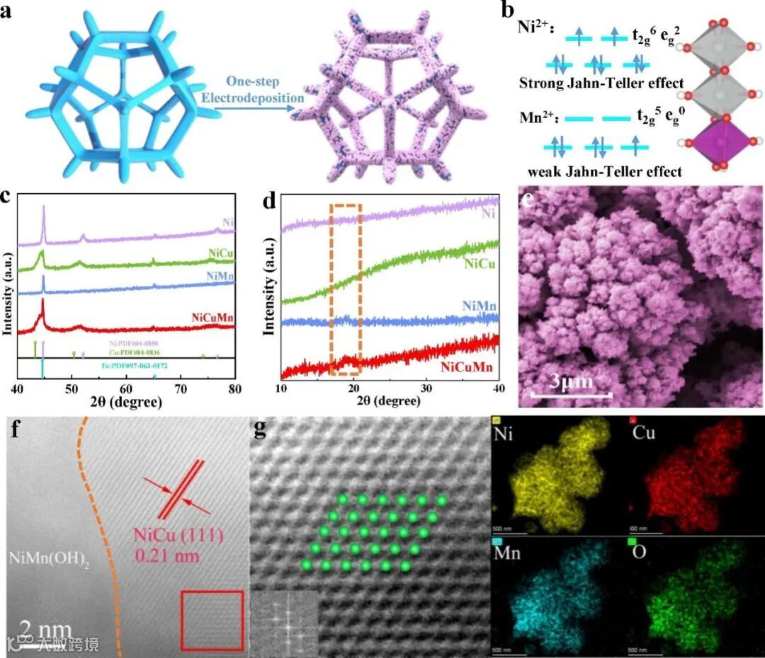 图2. (a)催化剂合成示意图。(b) Ni2+ 和 Mn2+ 的电子构型。(c,d) XRD图谱。(e) FE-SEM图谱。(f,g)HAADF- STEM。