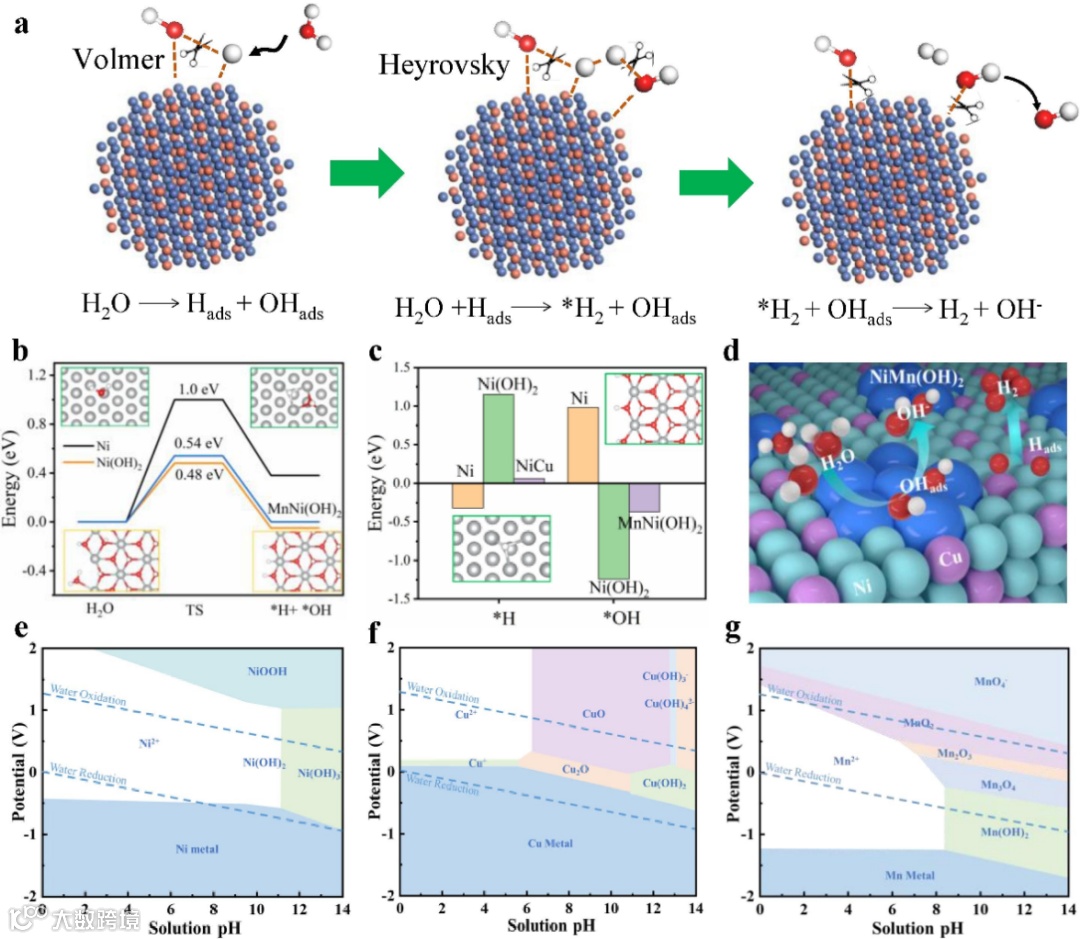 图1. (a)水解离示意图,(b) H2O 解离能垒和(c) Hads 和 OHads 在 Ni,NiCu,Ni(OH)2和 MnNi(OH)2上的吸附能。(d) 碱析氢反应的示意图。(e-g) Ni,Cu,Mn的 Pourbaix 图。