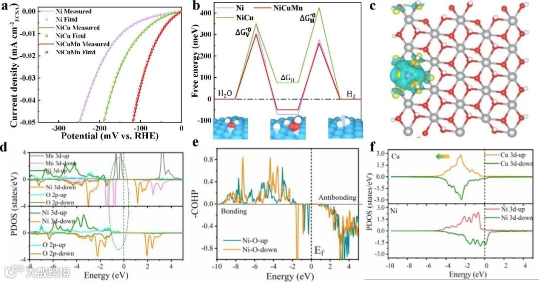 该工作通过一步电化学沉积法合成了相分离NiCu/NiMn(OH)2纳米复合材料(NiCuMn)。理论和实验结果表明,低电负性的 Mn 促进 NiMn(OH)2中低价态 Niδ+ 的形成,加速Volmer步动力学过程;Cu 的引入可以形成NiCu 合金相,优化d带中心,削弱Ni对Hads的吸附,促进后续Heyrovsky/Tafel 步骤。