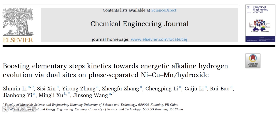 基于此,来自昆明理工大学的徐明丽教授和王劲松副教授在国际知名期刊Chemical Engineering Journal上发表题为“Boosting elementary steps kinetics towards energetic alkaline hydrogen evolution via dual sites on phase-separated Ni–Cu–Mn/hydroxide”的研究文章。