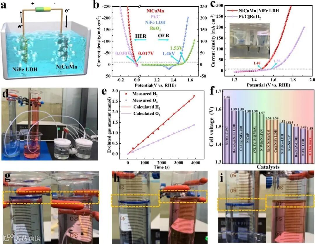 将 NiCuMn和NiFe LDH分别作为阴极和阳极(NiFe LDH || NiCuMn),以1.0 M KOH溶液作为电解液,进行全解水性能测试,仅需施加1.48V的电压即可实现10mA cm-2 , 而作为对比的贵金属电极Pt/C || RuO2电解槽驱动 10mA cm-2 时需施加1.58V的电压。此外,电催化析氢法拉第效率接近100%,全解水性能也优于大部分已报道的电催化剂。