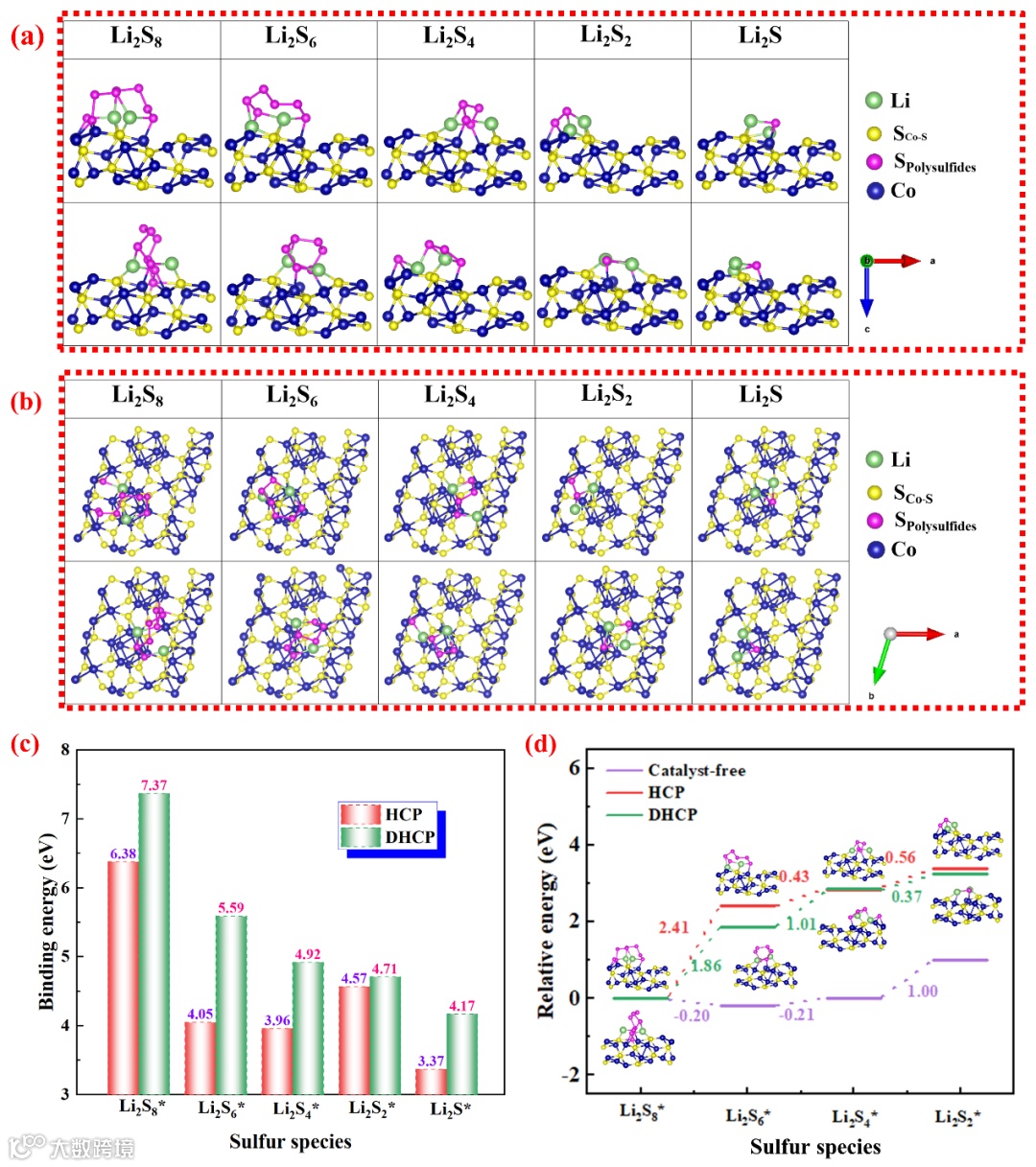 Figure 1. The optimized structures of Li2Sx (x=8, 6, 4, 2, 1) on HCP and DHCP substrates: a) side view and b) top view; c) Adsorption energies of HCP and DHCP substrates for different lithium polysulfides species; d) Relative Gibbs free energy profiles for the sulfur reduction reaction on HCP and DHCP substrates.