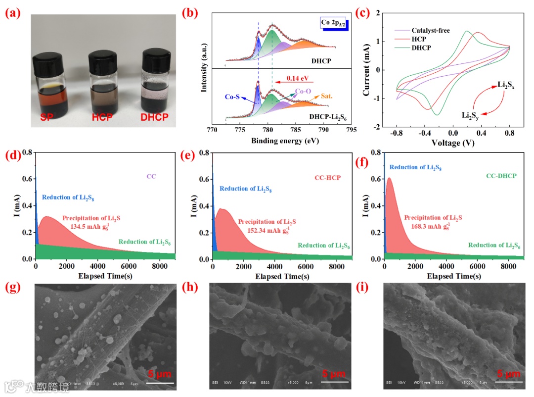 Figure 5. a) Static adsorption of Li2S6 solution; b) XPS Co 2p3/2 spectra of DHCP before and after adsorbing Li2S6; c) CV curves of the symmetric batteries based on catalyst-free, HCP and DHCP electrodes; Constant voltage discharge curves of d) catalyst-free, e) HCP and f) DHCP electrodes using Li2S8 solution as electrolyte; SEM images of corresponding Li2S deposits on g) catalyst-free, h) HCP and i) DHCP electrodes.