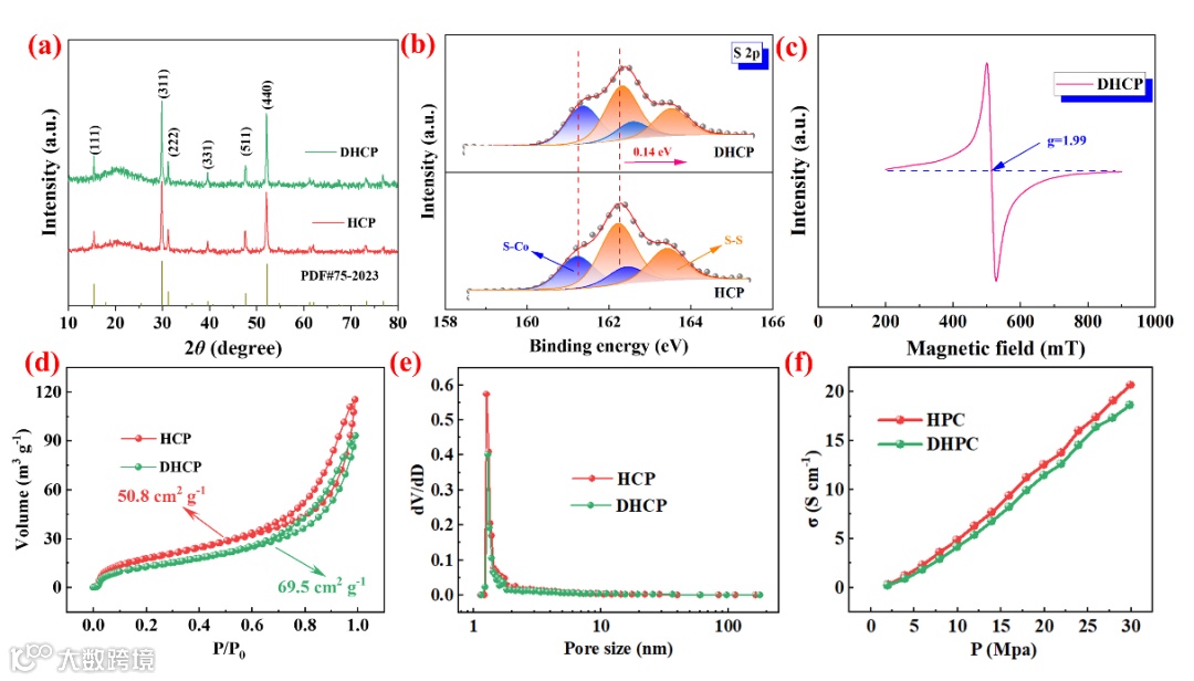 Figure 4. a) XRD patterns, b) S 2p spectra of HCP and DHCP; c) EPR of DHCP; d) N2 isothermal adsorption/desorption curves and e) corresponding pore distribution of HCP and DHCP; (f) Electronic conductivities of HCP and DHCP.