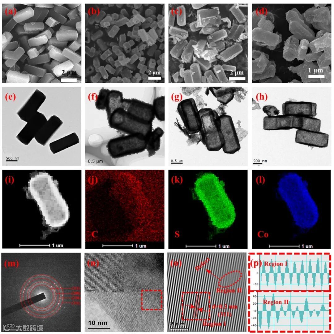 Figure 3. SEM images of a) Co-precursor, b) AHCP, c) HCP and d) DHCP; TEM images of e) Co-precursor, f) AHCP, g) HCP and h) DHCP; i) HAADF of DHCP and relevant elements mapping: j) C, k) S, l) Co; m) SAED and n) HRTEM of DHCP; o-p) Lattice spacing identification of different regions of DHCP.