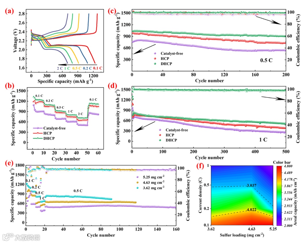 Figure 8 a) Constant current discharge/discharge curves of DHCP/S cathode at different rates; b) Rate performance, c) cycling performance at 0.5 C and d) cyclic stability at 1 C of catalyst-free/S, HCP/S and DHCP/S cathodes; e) Rate performance of DHCP/S cathode with different sulfur loading; f) areal capacity of DHCP/S cathode with various rates and sulfur loadings.