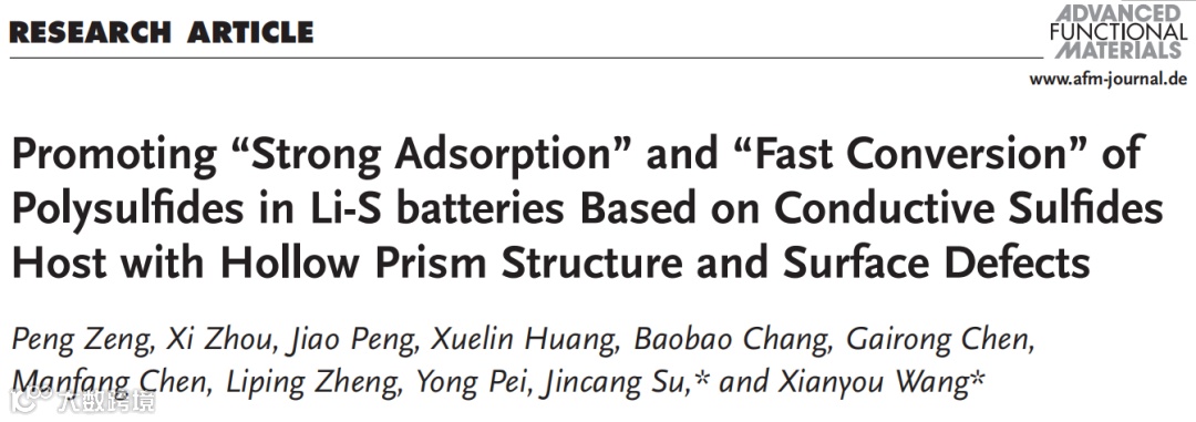 基于此,湘潭大学王先友教授团队在国际知名期刊Advanced Functional Materials发表题为Promoting “Strong Adsorption” and “Fast Conversion” of Polysulfides in Li-S batteries Based on Conductive Sulfides Host with Hollow Prism Structure and Surface Defects的研究论文,该文设计了一种具有空心棱镜结构和表面缺陷的导电硫化物宿主材料应用于锂硫电池,以同步实现对多硫化物的“强吸附”和“快转化”。