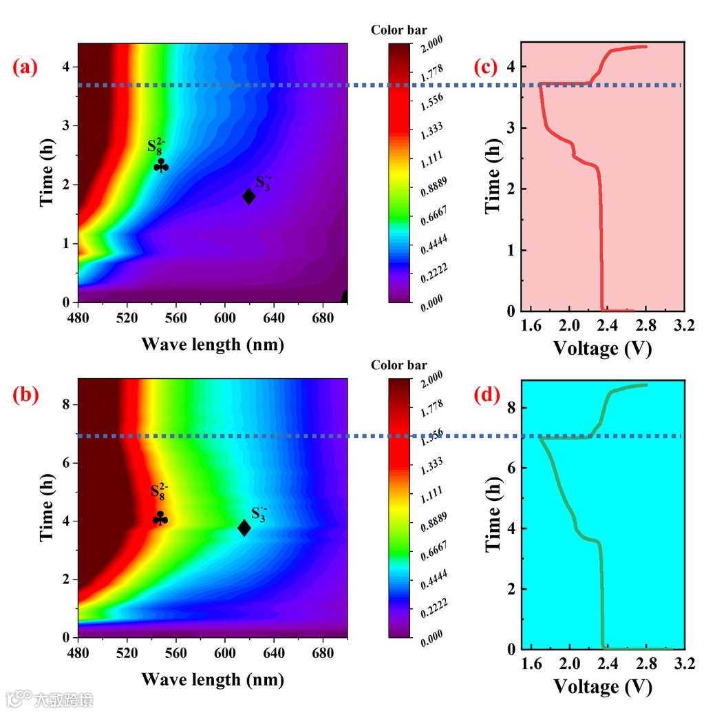 Figure 6 In situ UV-VIS spectroscopy of Li-S cell with a) HCP/S and b) DHCP/S cathodes; Relevant galvanostatic charge-discharge curves of c) HCP/S and d) DHCP/S cathodes.