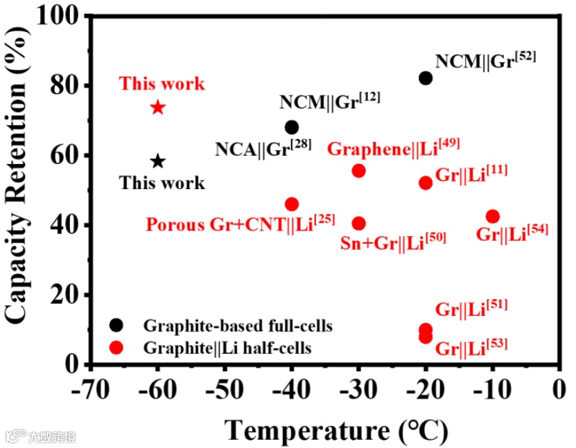 图 6、这项工作与其他文献中石墨基电池低温容量保持率的比较。