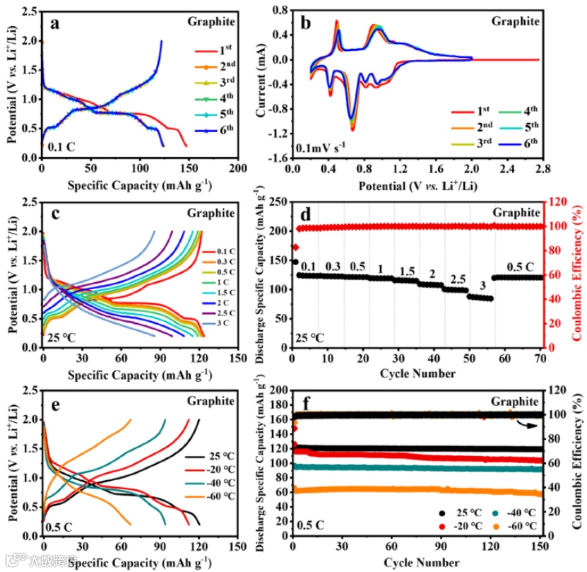 图 2、25 ℃下,石墨||Li半电池(a)在0.1 C下的恒流充放电曲线和(b)最初6个循环的CV曲线。石墨||Li半电池的(c)倍率性能和(d)相应循环稳定性。不同温度(25至-60°C)下,石墨||Li半电池(e)0.5 C下的恒流充放电曲线和(f)相应循环性能。