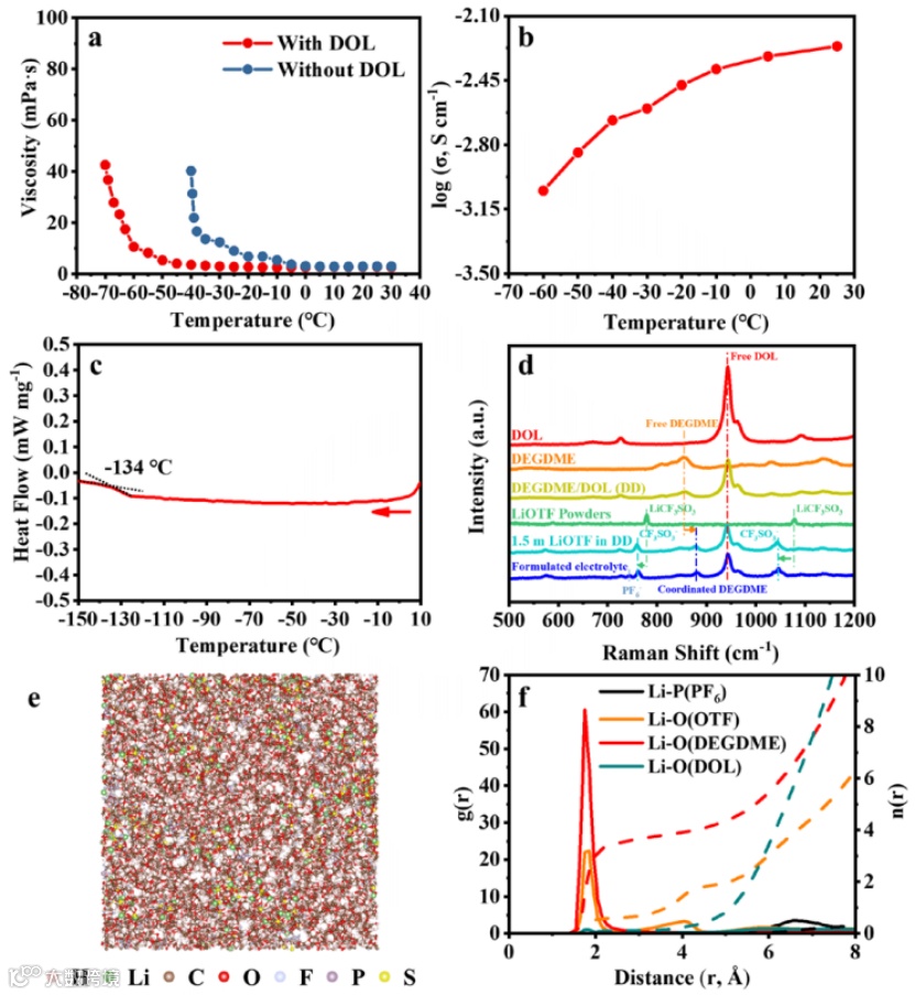 图 1、(a)在-70-30 ˚C内,有或没有DOL的电解质粘度随温度的变化。(b)电解质在-60-25 ˚C内的离子电导率随温度的变化。(c)电解质的DSC曲线。(d)各种电解质成分的拉曼光谱。电解质的(e)MD模拟快照和(f)Li+的RDF。