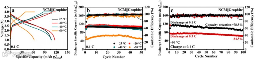 图 5、(a)不同温度下,NCM||石墨全电池在0.1 C下的充放电曲线和(b)循环性能。(c)全电池在0.1 C充电并在-40 ˚C下以0.1和0.3 C放电时的长循环性能。