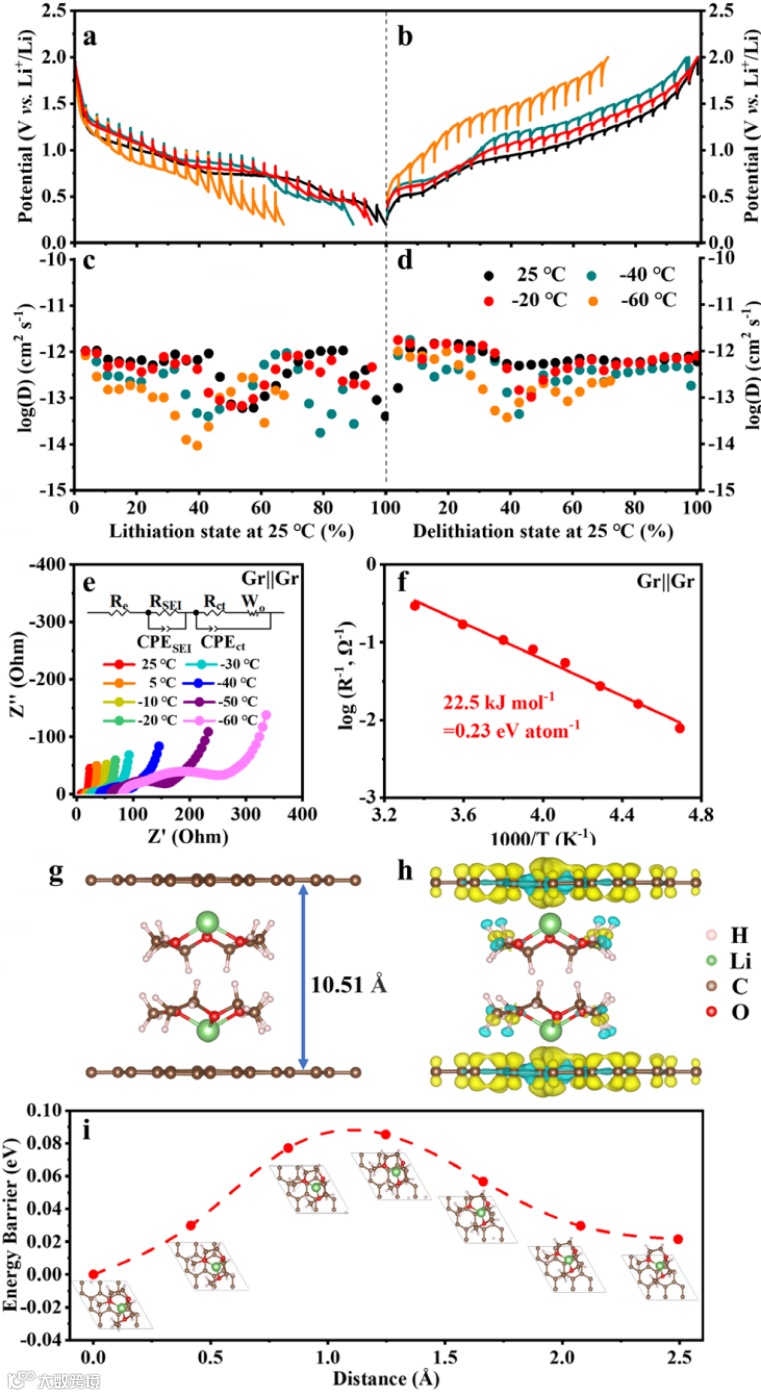 图 4、(a)锂化和(b)脱锂过程中不同温度下石墨||Li半电池的GITT曲线。在不同温度下,(c)锂化和(d)脱锂过程中溶剂化锂离子的化学扩散系数。(e)在不同温度下,石墨||石墨电池的奈奎斯特图。(f)通过Arrhenius曲线估计Rct的活化能。(g)石墨中双叠层Li-DEGDME配合物的模型。(h)溶剂化Li+插层石墨的计算电荷密度差异。(i)石墨中溶剂化Li+扩散的计算能垒。