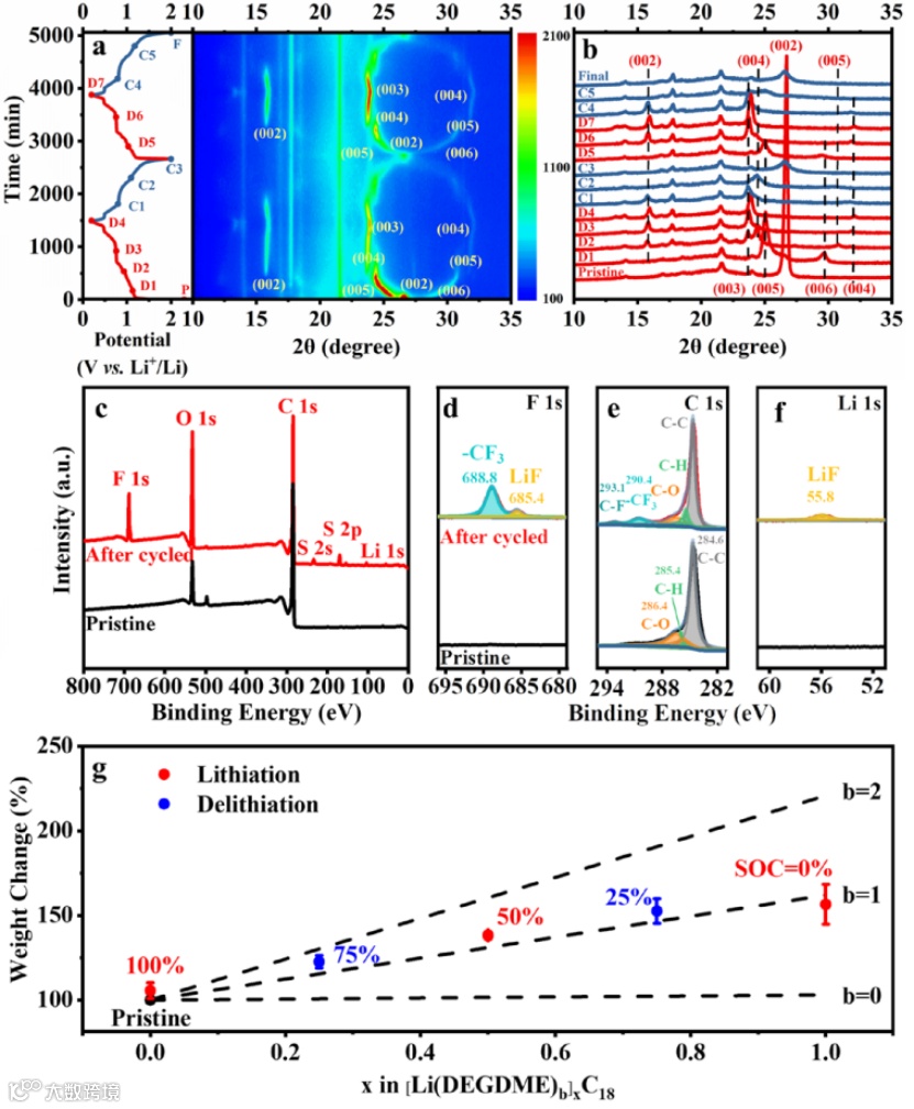 图 3、(a)石墨电极前两个锂化-脱锂循环期间的原位XRD图谱。(b)图(a)中充放电曲线标记点的XRD图案。原始和循环后石墨电极的(c)XPS全谱、(d)F 1s、(e)C 1s和(f)Li 1s光谱。(g)石墨电极在不同SOC下的重量变化。