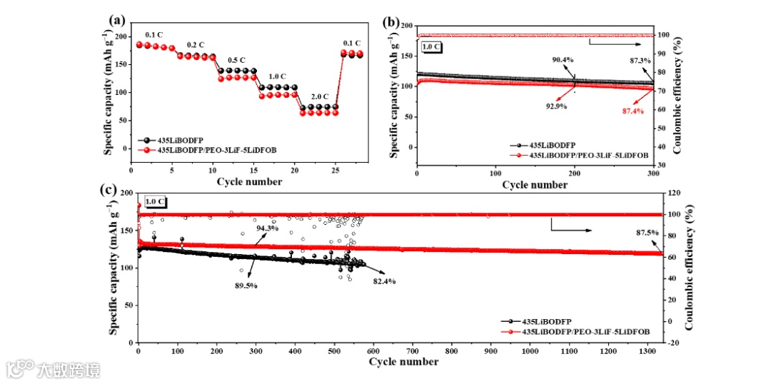 图6. (a)由单层和双层复合固态电解质膜组装的基于多晶NCM622的电池的倍率性能,(b) 由不同复合电解质膜组装的基于多晶NCM622电池在1.0 C下的长期循环性能,以及(c)由单层和双层复合固态电解质膜组装的基于单晶NCM622电池在1.0 C下的循环性能。